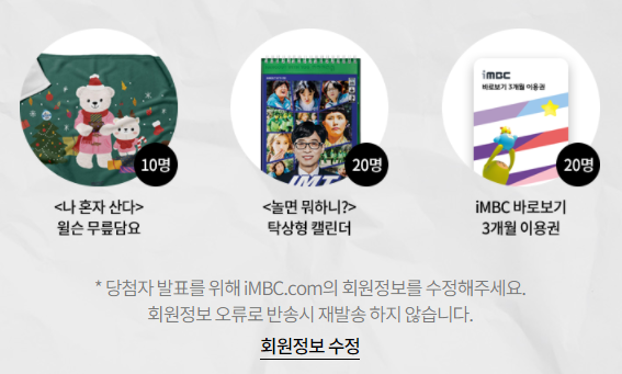 상품 : 나혼자산다 윌슨 무릎담요(10명), 놀면뭐하니 탁상형 캘린더(20명), iMBC 바로보기 3개월 이용권(20명)