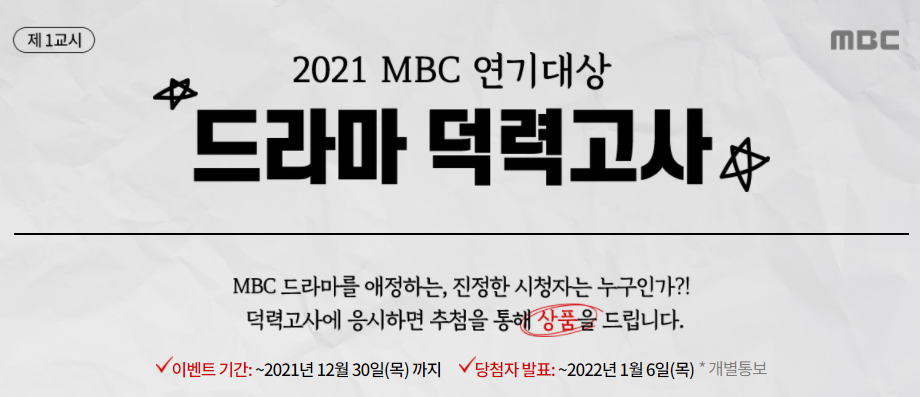 2021년 MBC 연기대상 안내와 함께 MBC 드라마 덕력고사 이벤트도 진행중에 있습니다.
