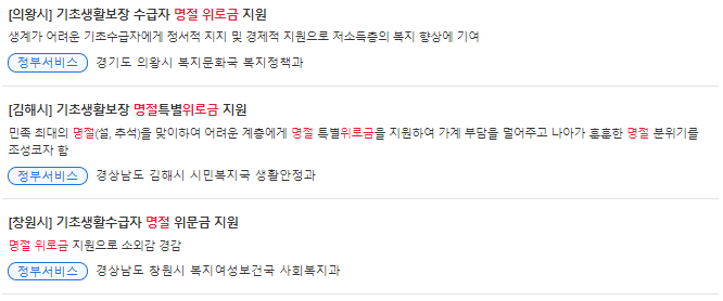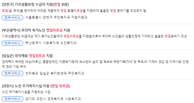 명절위로금을 가장 빠르게 찾을 수 있는 방법은 정부24에서 지역별로 명절위로금을 검색해보는 방법이 있습니다.