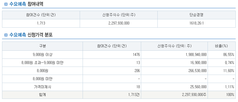 기관 경쟁률은 1,618.26:1이며 총 1713곳의 기관 투자자들이 참여하였습니다.