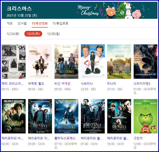 크리스마스 이브인 12월 24일부터 크리스마스 당일인 25일까지 다양한 TV 특선영화가 준비되어 있습니다.