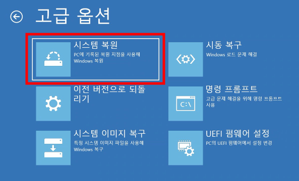 3. 고급옵션 - 시스템 복원을 눌러 줍니다.