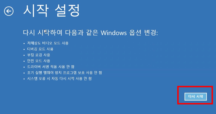 7. 다시 시작을 하면 컴퓨터가 재부팅이 시작되고 새로운 화면이 나오게 됩니다.