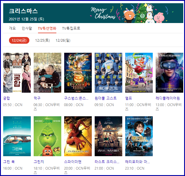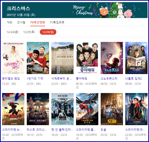 오늘은 이렇게 2021년 크리스마스 특선영화(성탄절 특선영화) 편성표를 알아보았습니다.